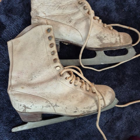 Kunstløpskøyter i størrelse 33 for barn. Skøytene er hvite og har tradisjonell snøring. Deilig for gjør at beina ikke blir så fort kalde