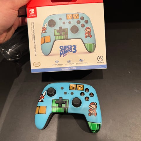 Selger en stilig Nintendo Switch kablet kontroller med Mario-design fra Rock Candy / PDP. Kontrolleren har gjennomsiktig rød utførelse med blå knapper og klassisk Mario-motiv.