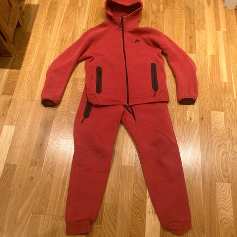 Nike Tech Fleeze for herre i størrelse M. Laget av bomull i grå farge. Inkluderer hettejakke med glidelås og matchende bukser.