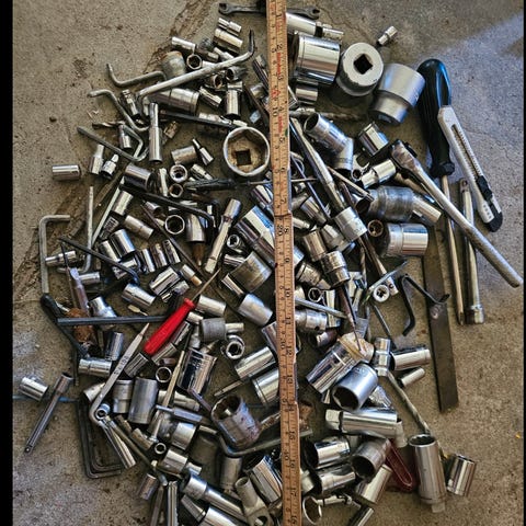 Pipenøkkelsett med skralle og piper i ulike størrelser.