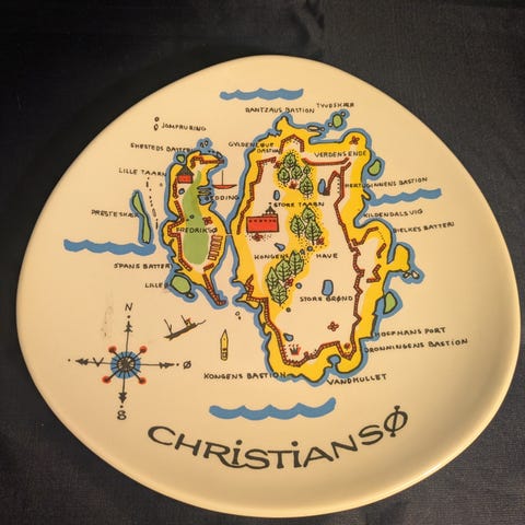 Retro veggplater i porselen fra Stavanger Flint med motiver av Roskilde-tårnet og Bryggen i Bergen. Signert av kunstneren Arvid Reikvam.