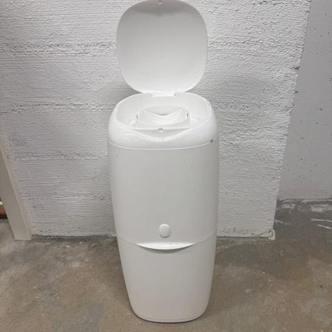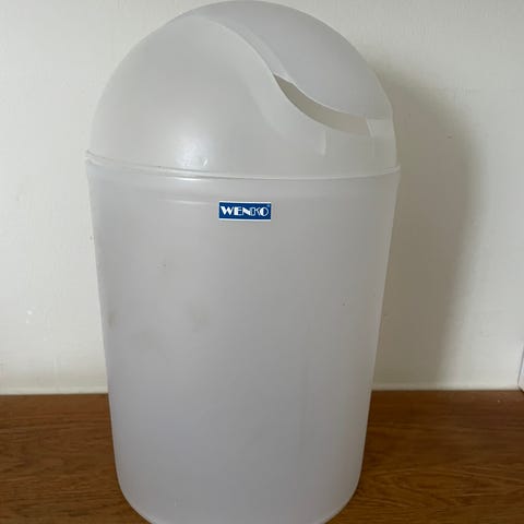 Bleiebøtte i turkis/lyseblå farge. Designet for oppbevaring av brukte bleier med enkel åpning og lukking for hygienisk håndtering.