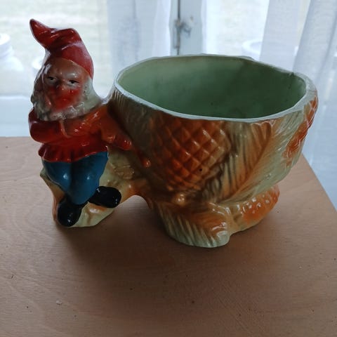 Tysk jule dekorasjonsornament med to nisser som holder en grønn kurv. Ornamentet er laget av keramisk materiale.