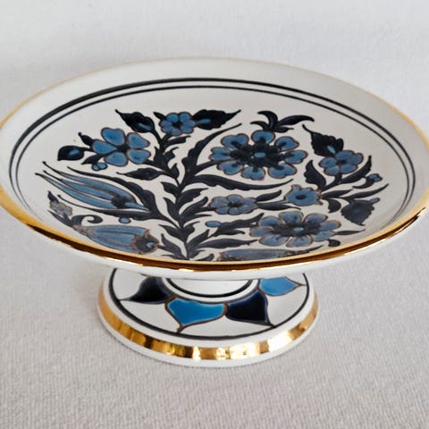 Unikt etasjefat satt sammen av to originale Stolt Margit-tallerkener fra Stavangerflint, designet av Anne Lofthus. Serien ble produsert i Norge på 1960-tallet og er i dag et ettertraktet eksempel på norsk brukskunst og folkekunstinspirert design.