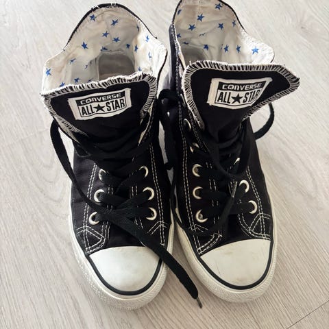 Converse i størrelse 38. Skoene er svarte og har en høy ankel. Laget i tekstil og gummi. Egnet for daglig bruk.