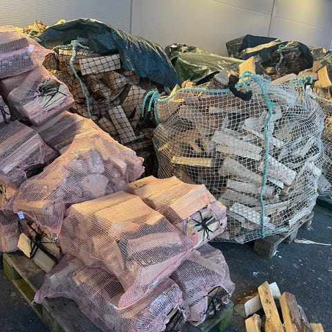 Har noen 1500 l sekker med blandingsved som står under tak.