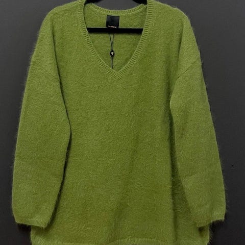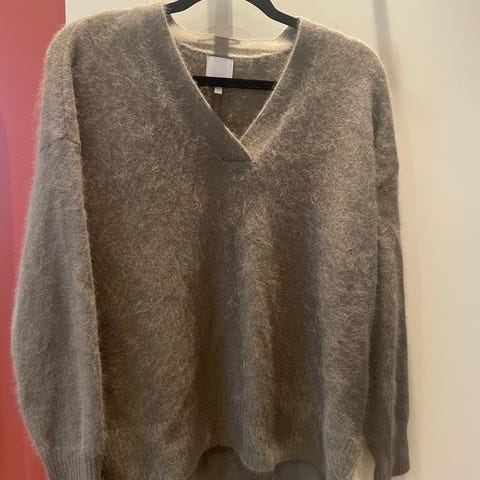 Ane Mone genser i størrelse L, farge blå, laget av 70% angoraull og 30% nylon. Genseren har korte ermer og rund hals, designet for kvinner.