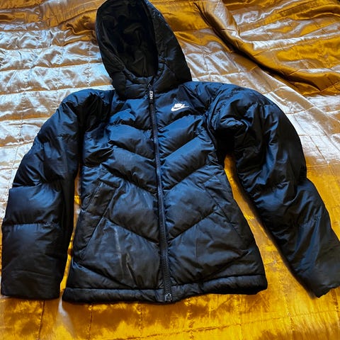 Nike dunjakke for barn i størrelse 147-158 i svart farge. Laget av dunmateriale som gir isolasjon og varme. Jakken har hette og glidelås, egnet for kaldt vær.