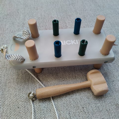 Micki bankebrett med gummihammer. Blå farge. Alle «spiker» følger med. Blitt banket på av et barn.