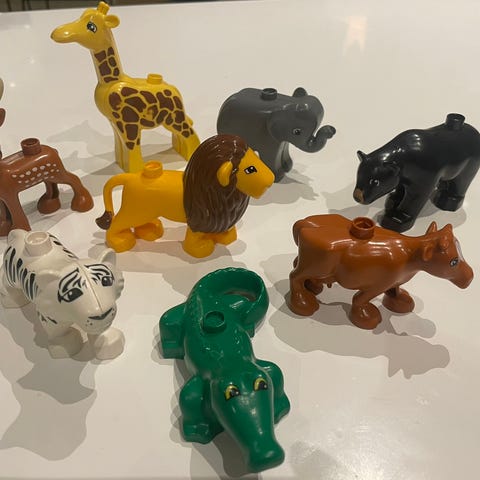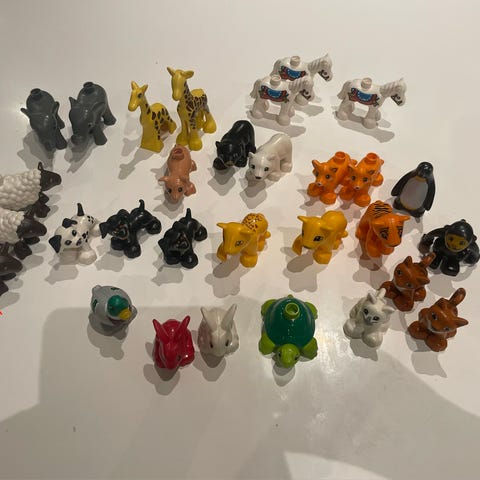 Søte Duplo figurer. Skal være en badeleke, men opplever at ringene synker fordi de får vann i seg. Ringene kan deles i to.