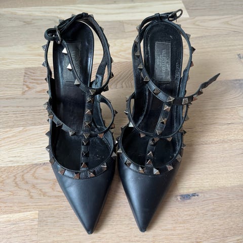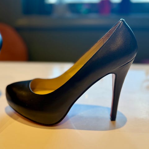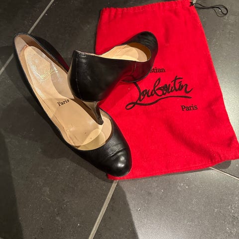 Størrelse 37,5. Nesten ikke brukt. Små sår nederst på hæl, se bilder. Ekstra såle på fremre del så farge ikke blir ødelagt ved bruk. Dust bag, kvittering og ekstra sett med hælbeskytter medfølger. Ny pris ca kr 6500. Selges for kr 2500.