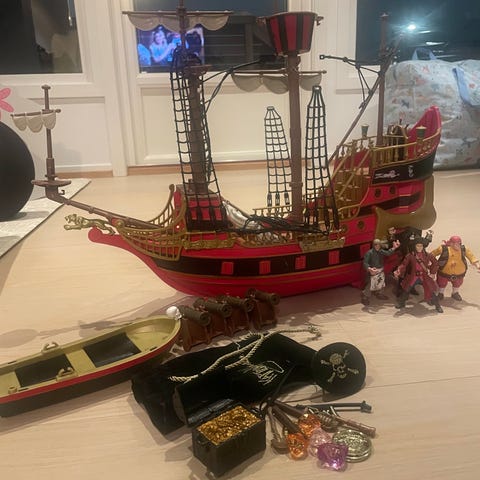 Kaptein Sabeltann skattekiste, pengeoung, ørering, diamanter og skattepose