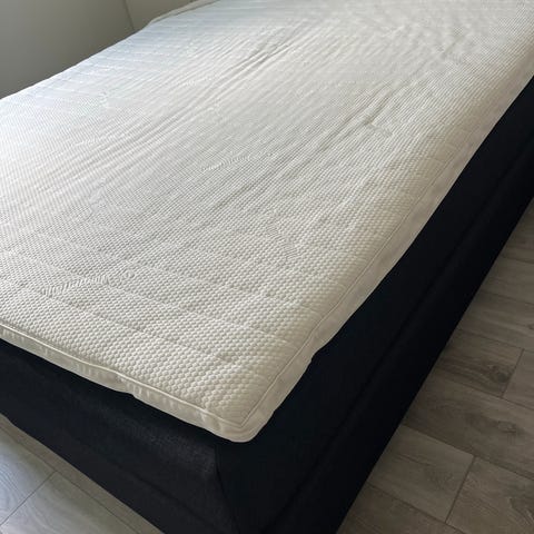 Madrass i hvitt stoff med kvadratisk quiltet mønster. Passer til dobbeltseng.