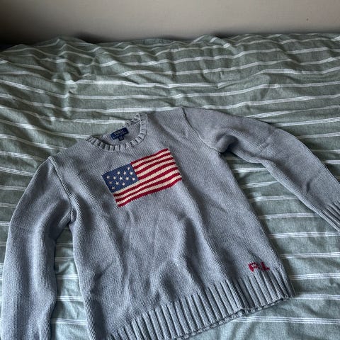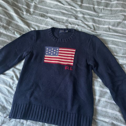Hei! Jeg selger en fantastisk fin genser som heter The Iconic Flag Jumper fra merket Ralph Lauren. Genseren er svært pent ivaretatt og lite brukt. Den er i størrelsen XL (18-20) som vil tilsvare en S og M i voksen størrelse:-)