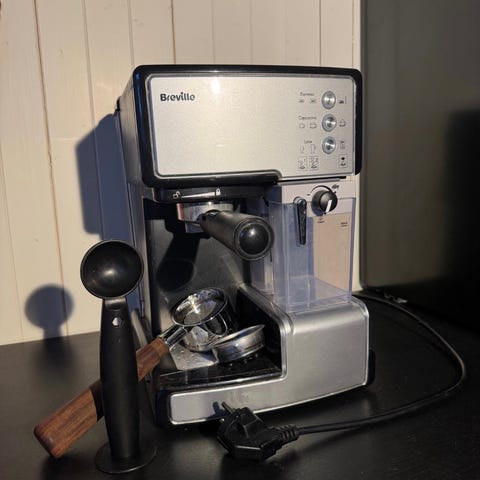 Lekker rød espressomaskin av typen Francis Francis X1, med god steamer og som varmer kopper på «lokket».