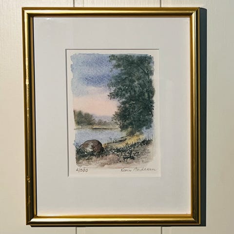 Agder, Hardangervidda, Rauland, Rauland skisenter, Vinje, Silkedalen, Nissedal, Gjerstad, Risør, Tvedestrand, Åmli, Vegårshei bygdekvinnelag, Vegårshei maleklubb, Astrid Vierli, norsk kunstner, norsk kunst, landskapskunst, naturkunst, akvarell, akvarellstil, kunsttrykk, grafikk, veggkunst, rammet kunst, Hov bru, steinbru, bro over elv, elvelandskap, bjørkeskog, skog, høstmotiv, høstfarger, norsk natur, innsjø, vann, svaberg, Fidalen, Ubergsmoen, Østlandet, klassisk kunst, tradisjonell kunst, tidløs stil, dekorativ kunst, hyttekunst, hyttebilder, stuebilder, gangbilde, kontorkunst, gullramme, sort passepartout, innrammet bilde, ferdig innrammet, bildeserie, sett med bilder, 1990-talls kunst, 90-tallet, vintage kunst, Høst, natur, vann, innsjø, båt, skog, Agder, Sørlandet,
