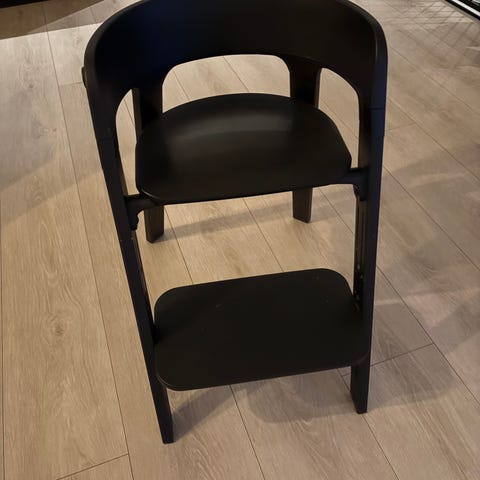 Stokke Steps høy barnestol i hvit og mørkt tre. Designet for barn med justerbare trinn og ryggstøtte for komfort og støtte. Laget av holdbare materialer egnet for barn.