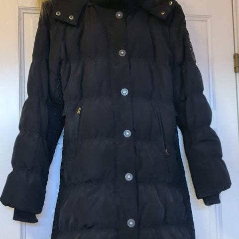 Grå dunkåpe i størrelse L. Med knapper og glidelås, samt lommer med klaff og knapp.