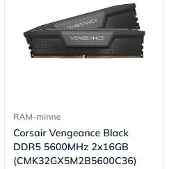 Corsair Vengeance RGB DDR5 RAM med en kapasitet på 32GB og en hastighet på 6200MHz CL36. Designet for høy ytelse i datamaskiner som støtter DDR5-minne.