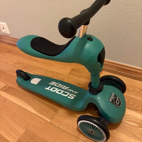 Scoot and Ride Sparkesykkel med sete i blå farge. Designet for barn med integrert sete som kan brukes til å sitte på eller som sparkesykkel. Utstyrt med tre hjul for stabilitet og håndtak for styring.