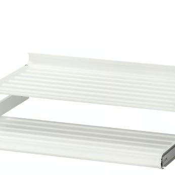 IKEA Boaxel veggmontert oppbevaringssystem i hvit farge. Systemet inkluderer 2 stk hyller i metall og 2 stk trådkurver. Både hyllene og trådkurvene kan flyttes slik man selv vil.
