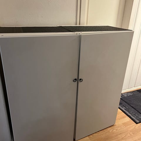 Blå skap laget i tre med to dører. Inneholder flere hyller for oppbevaring. Passer til organisering av klær, leker eller andre gjenstander.