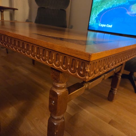 Salongbordet er tungt og stabilt. Platen oppe er stein og tåler en god del. Bordet er pent brukt, men steinoverflaten har over tid fått bruksmerker (se bilde). Bordet selges rimelig som følge av at det er brukt.
