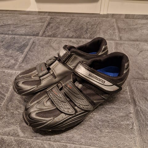 Shimano sykkelsko i størrelse 40 med svart og grå farge. Skoene har borrelås og snøring for justering. Passer til bruk med klikkpedaler, med feste for SPD-pedaler under sålen. Materialet består av mesh og syntetisk stoff for ventilasjon og holdbarhet.
