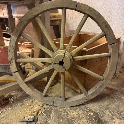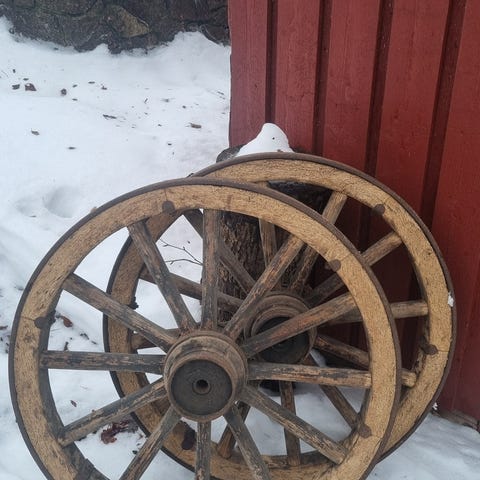 Selger et stort, gammelt hjul fra hestevogn. Hjulet har tidligere blitt brukt som dekor. Gir et unikt, rustikt og autentisk preg til både interiør og uteområder.