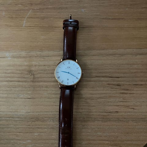 Daniel Wellington klokke med rund urskive og minimalistisk design. Klokken har en rem i tekstil med røde og blå striper. Den er egnet for både menn og kvinner.