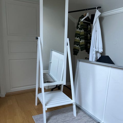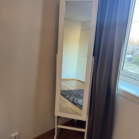 IKEA speil med integrert oppbevaring og klesstativ i hvit farge. Designet for å gi funksjonell oppbevaring av klær og tilbehør samtidig som det fungerer som et helfigursspeil.