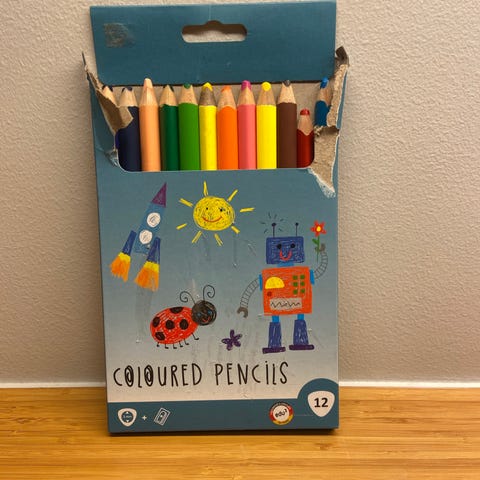 Sett med fargeblyanter. Boksen/esken følger med.