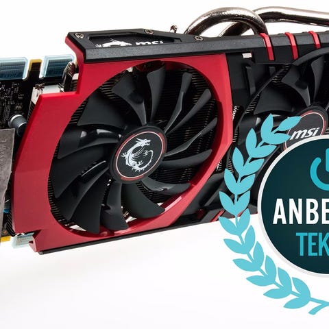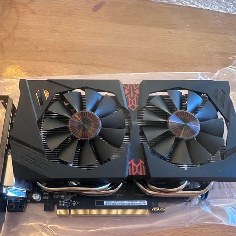 MSI GeForce GTX 960 2GB skjermkort med dobbel viftekjøling. Skjermkortet er designet for gaming og grafikkintensive oppgaver, og kobles til via PCIe-grensesnitt. Produktet har en svart og sølvfarget utforming.