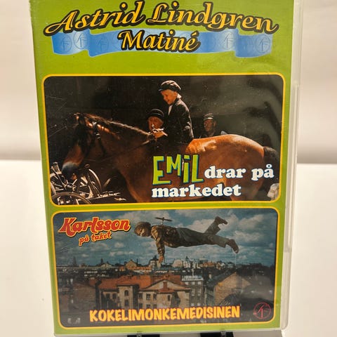 Astrid Lindgren Matiné DVD med to filmer: Emil drar på markedet og Karlsson på taket Kokelimonkemedisinen. DVD-format, norsk tekst. Passer for barn og familier.