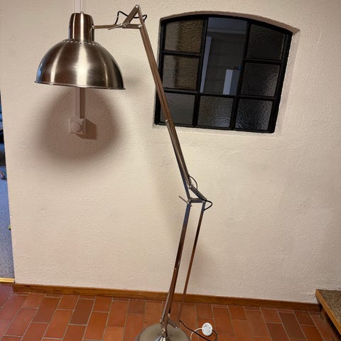 Hjørnelampe med lysdimmer selges til en god pris. Den er i god stand og den har blitt brukt pent, dermed lite bruksmerker på den. Det medfølger en lyspære, men hjørnelampen kan brukes med to lyspærer samtidig for sterkere lys. Høyden på lampen er justerbart.