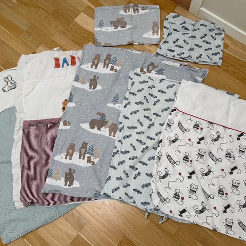 1x tisselaken (ubrukt, kun vasket) og 3 stretchlaken (60x120) i lyseblå, lysegrønn og hvit (ubrukt, kun vasket).