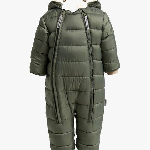 Varm, fôret Pilecub babydress fra Nordbjørn med en teddyfôret hette. Den er laget av tynn, varmende fleece og har doble glidelåser. Mulighet for å folde endene på ermer og ben over hender og føtter for ekstra varme.
