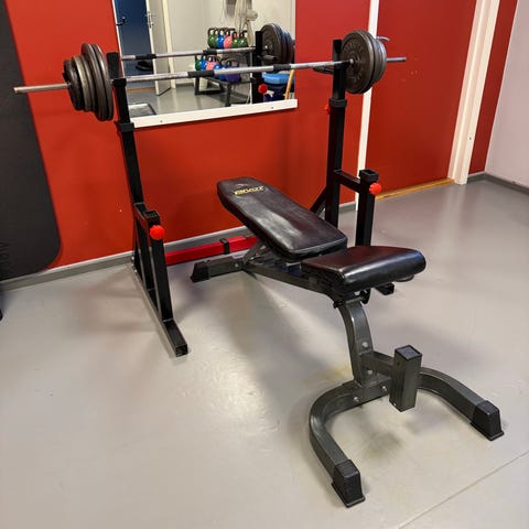 Benken har 3 'nivåer' å legge stangen på og justerbart sete (alle puter er i veldig god stand) så denne benken passer både liten og stor. Det er også 'pedaler' til å ha føttene på for bedre legdrive og en plattform bak til spotter. Det er også 3 pegger på hver side av maskinen til å ha vektskiver på.