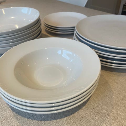 IKEA servise sett i blå porselen bestående av skåler og tallerkener. Settet inkluderer flere skåler og tallerkener med en enkel design i blå farge med hvite kanter.