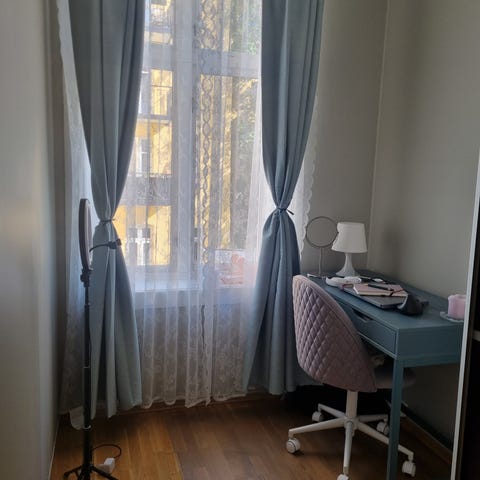 Selger to lengder med gjennomsiktig gardiner.
