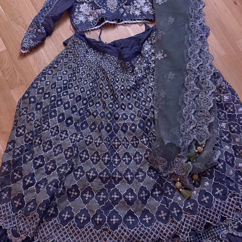 Selger en pent brukt pakistansk suit i størrelse S. Den er brukt kun 1 gang og passer ikke lenger. Utrolig fin suit med broderte detaljer på ermer og foran. Klærne består av tre deler, kameez, dubatta og trouser. Ingen bruksmerker.