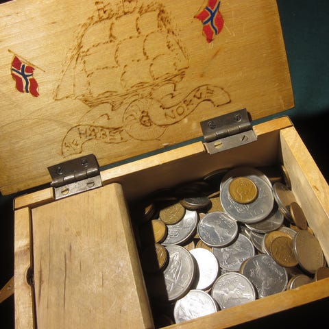 Skrinet har flat bunn, med ett innleggsbrett, med plass til 8 gullmynter og navneskilt.