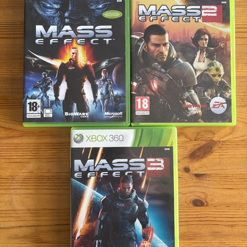 Mass Effect Xbox 360 spillserie bestående av Mass Effect, Mass Effect 2 og Mass Effect 3. Spillene leveres i original emballasje med tilhørende manualer og plater. Spillene er action-rollespill med science fiction-tema, utviklet for Xbox 360-konsollen.