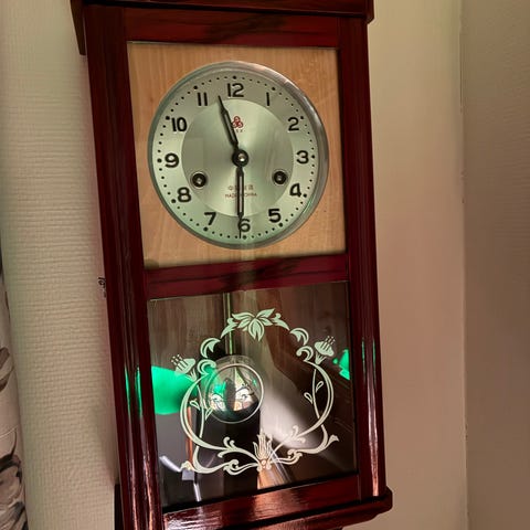 Selger en original Friedrich Mauthe veggklokke fra Tyskland, produsert ca. 1910–1930 (før 2. verdenskrig). Dette er en ekte mekanisk pendelklokke med fjærverk – ikke elektrisk eller batteridrevet.