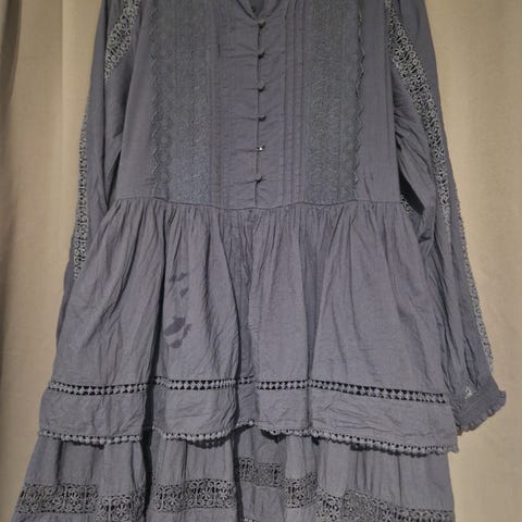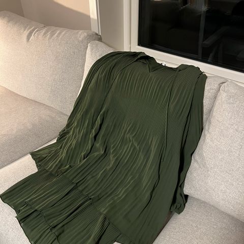 Har halvlange ermer og rekker til knærne. Knytting i livet og lommer på sidene.