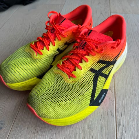 Asics Metaspeed Edge løpesko i størrelse 45. Skoene har vært med på tre halvmaraton løp og noen treningsløp. De blir litt for trange for min del så må nok kjøpe meg en halv str. større. Men helt nydelig sko!
