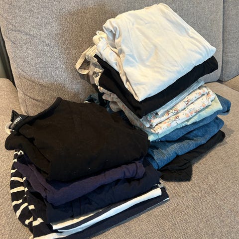 30+ plagg til gravid. Tshorter, gensere, bukser, kjoler, strømpebukser, et sett treningstøy, badetøy, ammesingletter og ammegenser. Mange av kjolene fungerer fint både til amming og gravid.