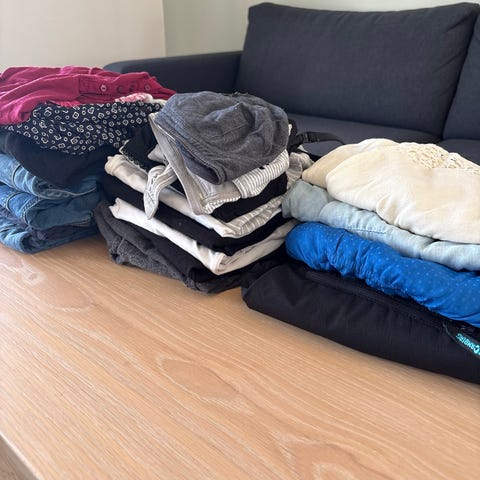 Noen plagg er godt brukt og har bruksmerker, en god del er knapt brukt eller ubrukt.