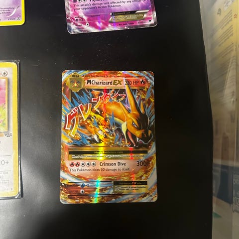 Pokémon Mega Charizard EX samlekort med illustrasjon av Charizard. Kortet har en holografisk overflate og viser angrepet Crimson Dive med 300 skade. Kortet er i brukstilstand med synlige bøyninger og slitasje på kantene.