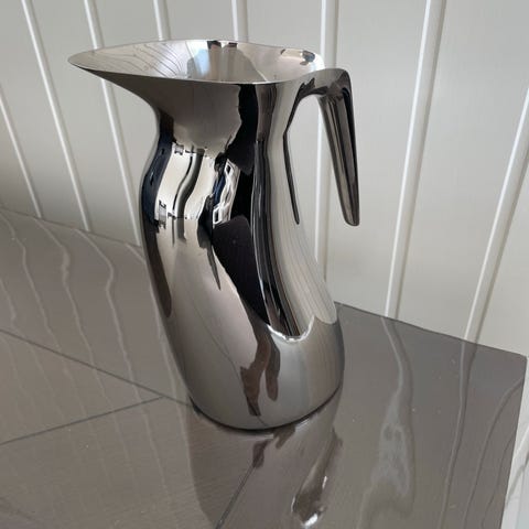Georg Jensen glasskaraffel med elegant, buet design. Karaffelen er laget av klart glass og egnet for servering av vin eller andre drikker. Designen sikrer enkel helling og lufting av innholdet.